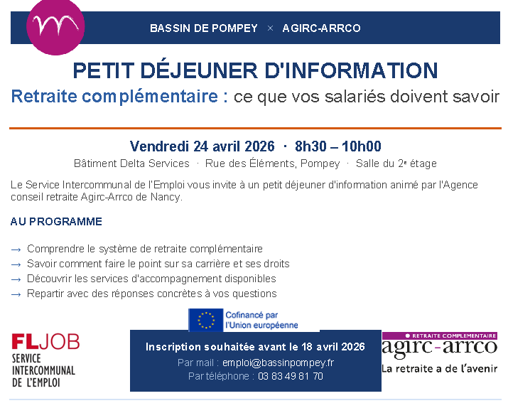 Inscrivez-vous vite avant le 18 avril : emploi@bassinpompey.fr - 03 83 49 81 70